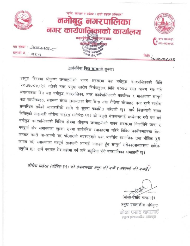काठमाडौं–काभ्रेको नमोबुद्ध नगरपालिकाले भोली २७ गते कृष्ण जन्माष्टमीको दिन सार्वजनिक बिदाको सुचना प्रकाशित गरिएको छ । आज एक सुचना प्रकाशित गर्दै नमोबुद्ध नगरपालिकाको कार्यलय र मातहतका सम्पूर्ण वडा कार्यलयहरु, स्वास्थ्य तथा शैक्षिक संस्थाहरु समेत बन्द रहने सुचनामा उल्लेख गरिएको छ ।