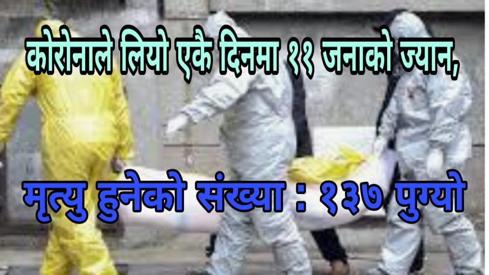 शुक्रबार मृत्यु हुनेमा एक महिला र दश पुरुष रहेका छन् । यो सँगै शुक्रबारसम्म कोरोनाभाइरस संक्रमणबाट मृत्यु हुनेको संख्या १३७ पुगेको स्वास्थ्य मन्त्रालयका प्रवक्ता डा जागेश्वर गौतमले जानकारी दिए ।