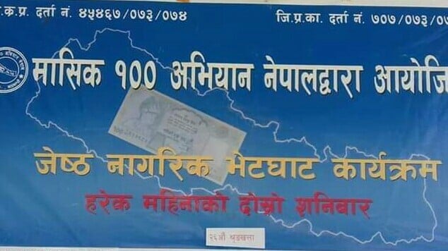 यो संस्थाले प्रत्यक महिनाको दोस्रो शनिवार १२ बजे देखि २ बजे सम्म ज्येष्ठ नागरिक भेट घाट कार्यक्रम सन्चालन गर्दै आएकोमा विश्वभरी नै महामारीको रुपमा फैलिरहेको कोरोना भाइरसका कारण सो कार्यक्रम हाललाई स्थगित गरिएको संस्थाका अध्यक्ष सन्ञय पोखरेलले जानकारी दिएको छ । अध्यक्ष पोखरेलको अनुसार मासिक १०० अभियान नेपाल सबैको साझा अभियान भएको हुंदा जो सुकै ब्यक्ति पनि यो अभियानमा सहभागि हुन सक्नुहुनेछ । अभियानमा सहभागि हुनका लागि मात्र मन, बचन र कर्मका साथ मासिक १०० दान गर्न तत्पर हुनुपर्नेछ ।