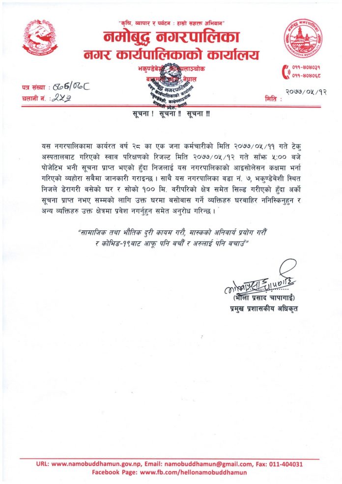 संक्रमित कर्मचारी नमोबुद्ध नगरपालिका वडा नं. ७, भकुण्डे स्थित डेरा गरी बस्दै आएका थिए । कोरोना पुष्टि भए लगतै उनि बसेको घर र सोको १ सय मिटर वरिपरिको क्षेत्र समेत सिल गरिएको छ । शुक्रबार प्रमुख प्रशासकीय अधिकृत भोलाप्रसाद चापाईंले एक सूचना जारी गर्दै सिल गरिएको जानकारी दिएका हुन् ।