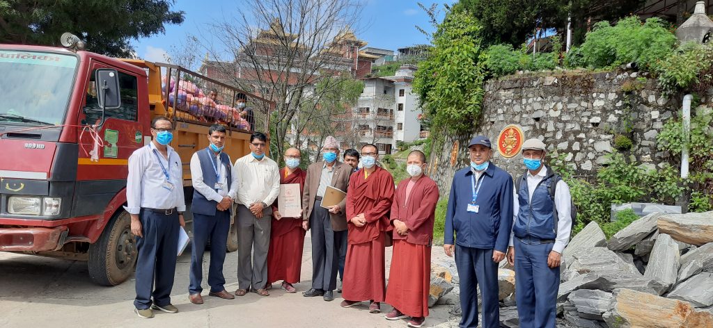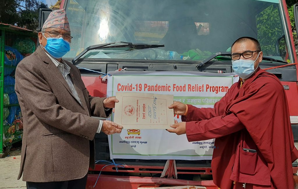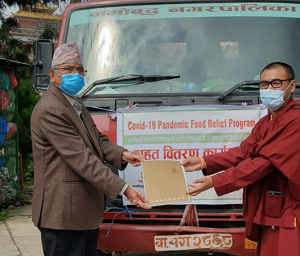 आज नमोबुद्ध गुम्बामा आयोजित एक कार्यक्रमका बीच गुम्बाका अध्यक्ष लामा खाम्सुङले नगर प्रमुख टिपी शर्मा तिमल्सिनालाई राहत प्याकेज हस्तान्तरण गर्नुभएको थियो । राहत प्याकेज हस्तान्तरण कार्यक्रममा नमोबुद्ध नगरपालिकाका प्रमुख प्रशाकीय अधिकृत भोलाप्रसाद चापागाईं, सामाजिक परिचालन संयोजक श्याम खनाल लगायतको उपस्थिति रहेको थियो ।
