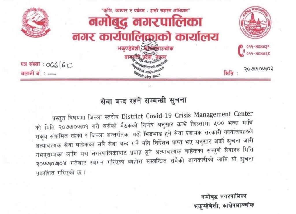 काठमाडौ–काभ्रेको नमोबुद्ध नगरपालिकाबाट प्रवहा हुने अत्यावश्यक बाहेकका सबै सेवा ४ गतेबाट बन्द हुने भएको छ ।