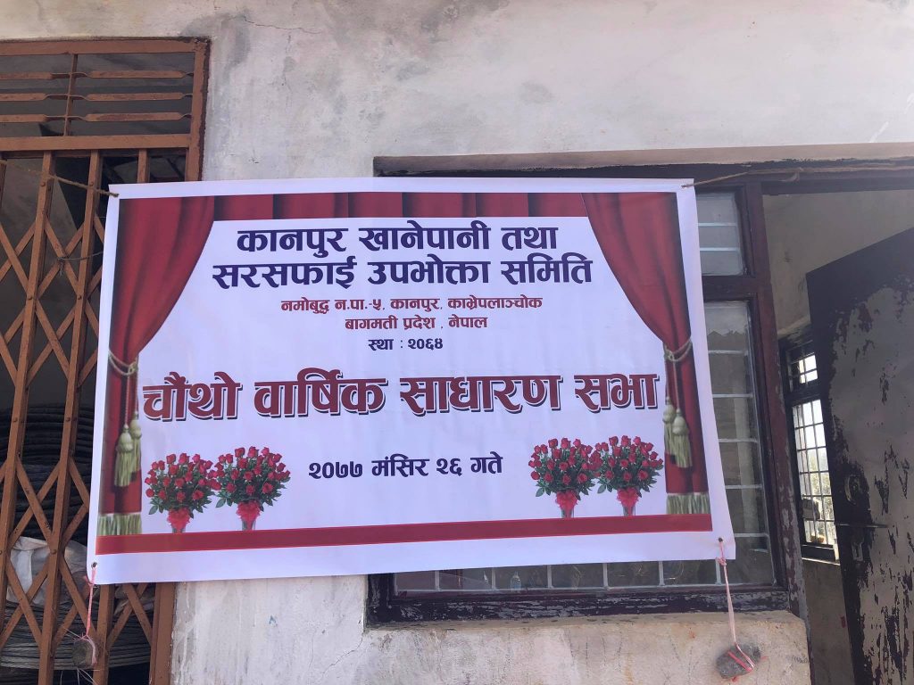काठमाडौ–काभ्रेको नमोबुद्ध नगरपालिका वडा नं.५ स्थित कानपुर खानेपानी तथा सरसफाई उपभोक्ता समितिको चौंथो साधारण सभा शुक्रवार सम्पन्न भएको छ ।