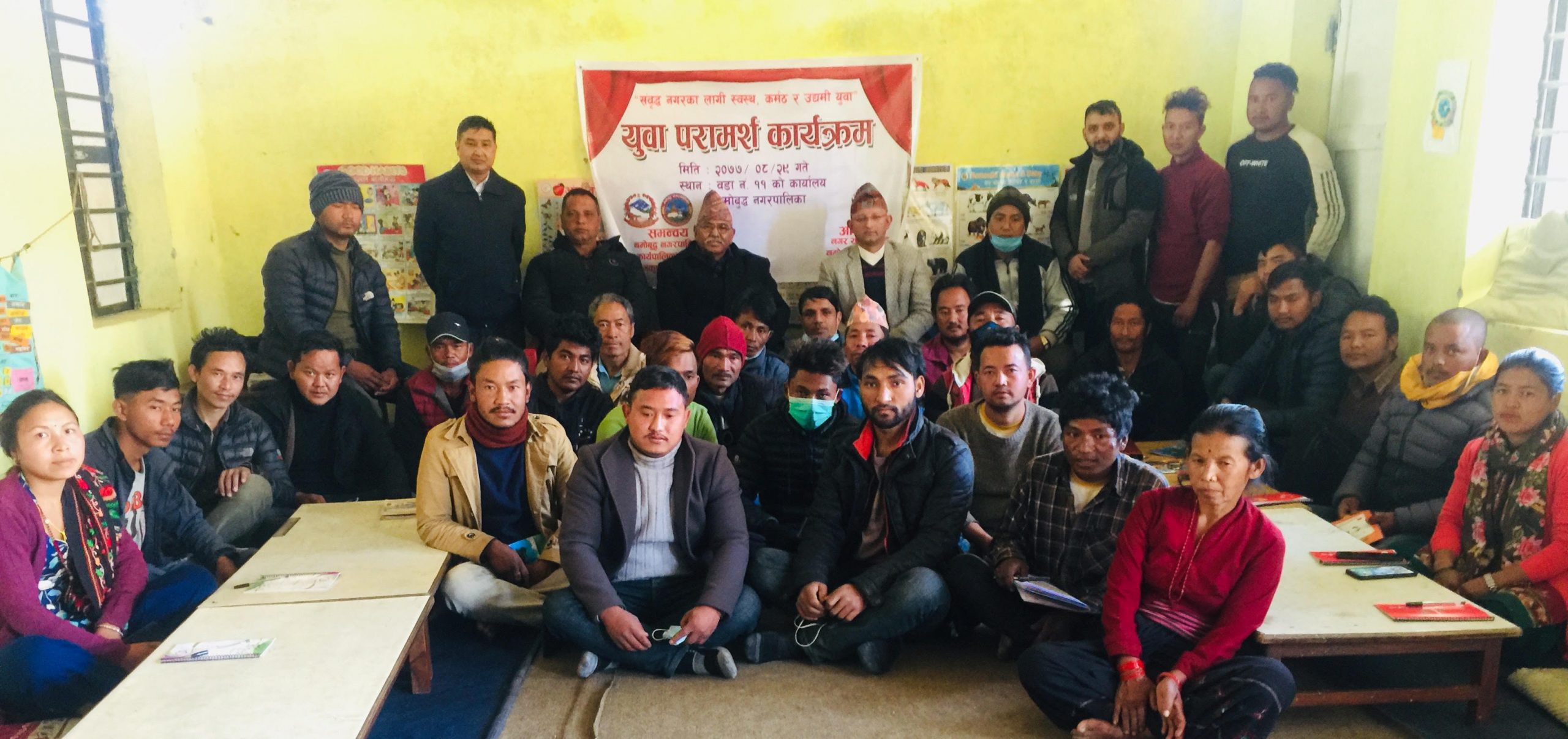 सोही क्रममा नगरपालिकाको वडा नंं। ११ भित्रका युवालाई सोमबार परामर्शको कार्यक्रम गरेको छ । नगर युवा परिषद्का कार्यकारी उपाध्यक्ष अशोक खनालको अध्यक्षतामा नगर प्रमुख टिपी शर्मा तिमल्सिनाको प्रमुख आतिथ्यतामा सम्पन्न कार्यक्रममा नमोबुद्ध नगरपालिकाका प्रमुख प्रशासकिय अधिकृत राजन पौडेल, नगर युवा परिषद्का सदस्य सचिव एवं शिक्षा युवा तथा खेलकुद शाखाका प्रमुख जनार्रदन रिजाल, वडा नं १० का वडा अध्यक्ष रामकृष्ण उपाध्याय, वडा नं ११ का वडा अध्यक्ष कृष्ण बहादुर तामाङ नगर युवा परिषद्का सदस्य लगायत ४० जना युवाहरुको सहभागिता थियो । कार्यक्रममा नगर प्रमुख तिमल्सिनाले नगरपालिकाभित्र युवाहरुको उद्यमशिलता रोजगारीका लागि सहुलियतपूर्ण कर्जा प्रवाहलाई सहज बनाउने, युवाहरुको क्षमाता बिकाश गर्दै नगरलाई युवामैत्री नगर बनाउने प्रतिवद्धता व्यक्त गर्दै यस्को सुरुवात ११ नंम्वर वडा बाट भएको बताए ।