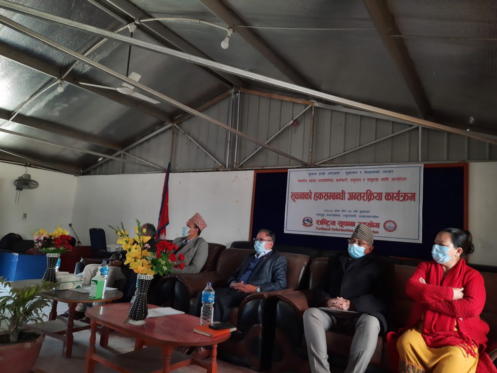 कार्यक्रममा राष्ट्रिय सूचना आयोगका सचिव डा।मुकुन्दप्रसाद पौड्याल र उपसचिव कपिलप्रसाद पौड्यालले सूचनाको हकका विषयमा कार्यपत्र प्रस्तुत गरेका थिए । कार्यक्रममा नमोबुद्ध नगरपालिकाका उपप्रमुख रामदेवी तामाङ, वडा अध्यक्षहरु लगायतको पनि उपस्थिति रहेको थियो ।