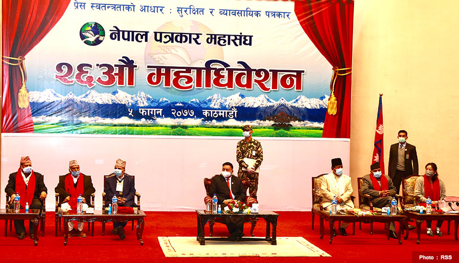 काठमाडौ । पत्रकारहरुको छाता संगठन नेपाल पत्रकार महासंघको २६ औं महाधिवेशन काठमाडौंमा सुरु भएको छ । ‘प्रेस स्वतन्त्रताको आधार: सुरक्षित र व्यवसायिक पत्रकार’ भन्ने मुख्य नारासहित महासंघको महाधिवेशन सुरु भएको हो ।