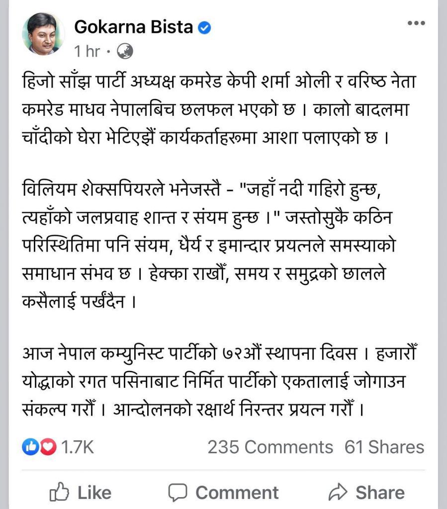 जस्तोसुकै कठिन परिस्थितिमा पनि संयम, धैर्य र इमान्दार प्रयत्नले समस्याको समाधान सम्भव रहेको कुरा बताउंदै पार्टीको एकतालाई जोगाउन संकल्प गर्न समेत विष्ट गरेले अपिल गरेका छन् ।
