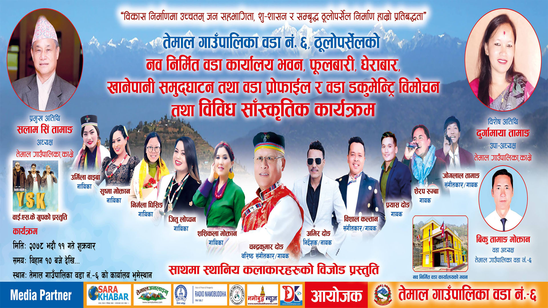 । काभ्रेको तेमाल गाउँपालिका वडा नं ६ ठुलो पर्सेलमा नव निर्मित वडा भवन उद्घाटन, वडा प्रोफाईल बिमोचन, वडाको बृत्तचित्र सार्वजनिक संगै विविध संस्कृतिक कार्यक्रमको तयारी सम्पन्न भएको छ ।