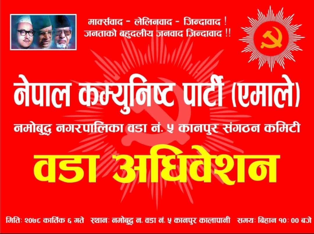 काठमाडौ । नमोबुद्ध नगरपालिमा वडा नं.५ कानपुरमा नेकपा (एमाले) को वडा अधिवेशन सम्पन्न भएको छ । शनिबार देशैभर एकैसाथ पार्टी अध्यक्ष केपी शर्मा ओलीद्धारा भर्चुवल मार्फत उद्घाटन गर्ने कार्यक्रम रहेकोमा सोही अनुसार कानपुरमा पनि प्रोजेक्टर मार्फत अध्यक्ष केपी शर्मा ओलीको सम्बोधन देखाए पश्चात औपचारीक रुपमा कार्यक्रम शुरुवात गरेका थिए ।