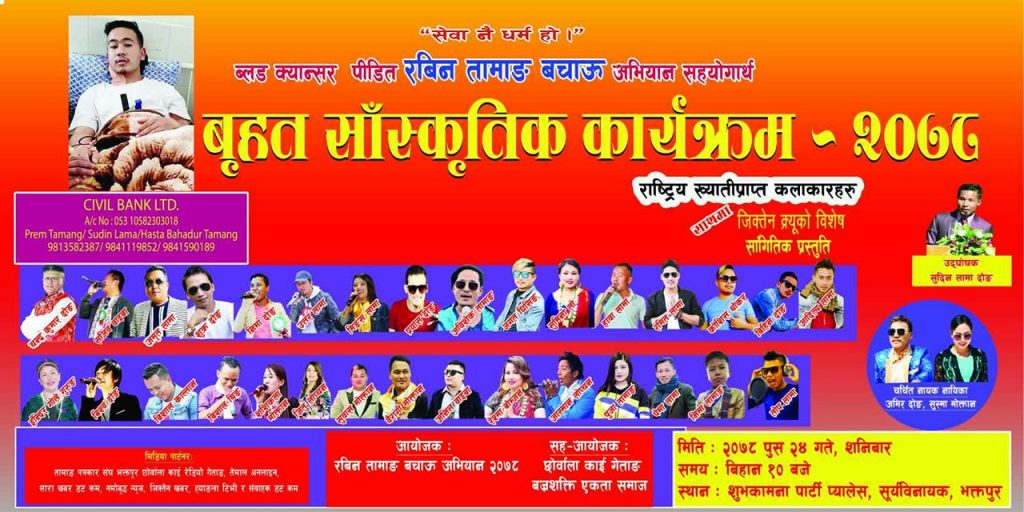 काठमाडौ । ब्लड क्यान्सर पीडित रविन तामाङ बचाउ अभियान सहयोगार्थ वृहत् साँस्कृतिक कार्यक्रम २०७८ भक्तपुरमा हुने भएको छ । काभ्रेको तेमाल गाउंपालिका वडा नंं.९ निवासी बर्ष २१ को ब्लड क्यान्सर पीडित रविन तामाङ लाई नयां जीवन दिनका निमित्त सहयोगार्थ कार्यक्रम स्वरुप वृहत् साँस्कृतिक कार्यक्रम २०७८ आयोजना गरिएको हो ।
