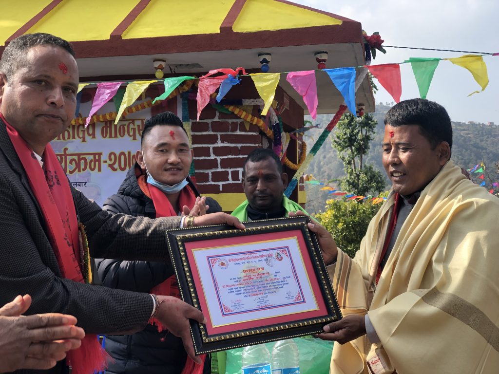 नमोबुद्ध नगरपालिका अन्तर्गत १० नं वडाको सिलिङ बजेटबाट तीन लाख पचार हजार र अन्य संघ संस्था तथा व्यक्तिहरुबाट आर्थिक संकलन गरि उक्त मन्दिरको निर्माण सम्पन्न भएको हो ।
