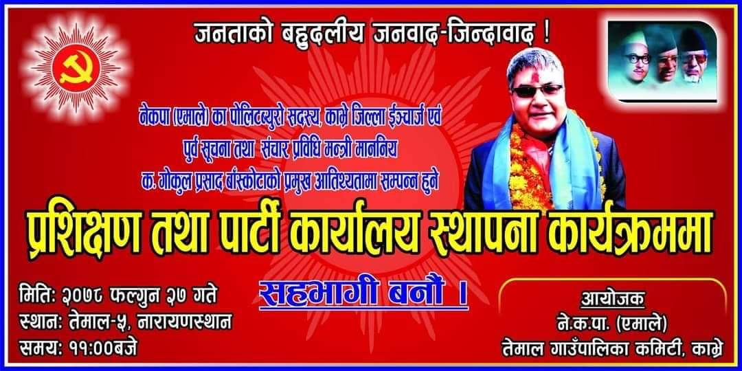 जापान- नेकपा एमाले तेमाल गाउॅंपालिकाको आयोजनामा स्थानीय निर्वाचन प्रशिक्षण तथा पार्टी कार्यालय स्थापना कार्यक्रम आउॅंदो फाल्गुन २७ गते तेमाल ५ नारायणस्थानमा हुने भएको छ। नेकपा एमालेका पोलिटब्युरो सदस्य,काभ्रे जिल्ला ईन्चार्ज एवं पूर्व सुचना तथा संञ्चारमन्त्री गोकुल प्रसाद बास्कोटाको प्रमुख अतिथ्यतामा उक्त कार्यक्रम हुने कुरा तेमाल गाउॅंपालिका कमिटी सह-सचिव सुरेन्द्र तामाङले जानकारी दिनुभएको हो।