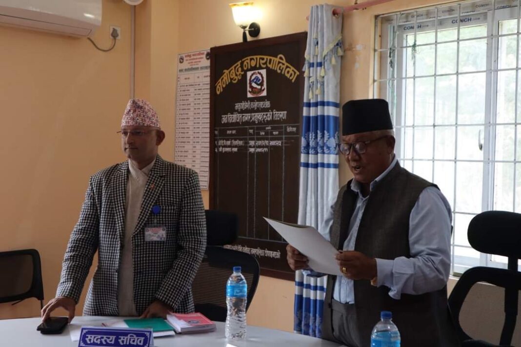 काठमाडौ– नमोबुद्ध नगरपालिकाको पहिलो कार्यपालिका बैठक प्रवक्ता चयन र न्यायिक समिति गठन गर्दै सम्पन्न भएको छ ।बिहिवार नगर प्रमुख कुनसाङ लामाको अध्यक्षतामा बसेको कार्यपालिकाको पहिलो वैठकले नगर कार्यपालिकाको निर्णय, बिज्ञप्ति, सार्वजनिक महत्वका सूचना लगायत सार्वजनिक गर्ने कार्यका लागि वडा नं ६ का वडा अध्यक्ष टिकाबहादुर केसीलाई प्रवक्ता तोक्ने निर्णय गरेको छ । बैठकले हरेक कार्यपालिका बैठकका निर्णयहरू नगरपालिकाको आधिकारिक वेबसाइटबाट सार्वजनिक गर्ने निर्णय पनि गरेको छ । प्रवक्ता टिकाबहादुर केसीका अनुसार आजको बैठकले नगर उपप्रमुखको संयोजकत्वमा रहने न्यायिक समितिलाई पुर्णता पनि दिएको छ । समिती संयोजक उपप्रमुख रत्नबहादुर लामा रहेका छन् भने समिति सदस्यमा वडा नं ४ का वडा अध्यक्ष अर्जुनबहादुर कार्की र वडा नं ७ का वडा अध्यक्ष धर्मसिं लामा रहेका छन् । बैठकले मेथिनकोट अस्पतालको व्यवस्थापन समितिमा नगरपालिकाबाट सदस्य रहने व्यवस्था अनुसार वडा नं ३ का वडा अध्यक्ष रमेश तिवारीलाई सदस्य तोक्ने निर्णय गरेको छ भने नगरपालिकामातहत रहेको एउटा एम्बुलेन्सलाई दाप्चा स्वास्थ्यचौकी मातहत राखेर सञ्चालन गर्ने निर्णय पनि गरेको छ ।कार्यपालिकाको पहिलो बैठक अघि नगर प्रमुख कुनसाङ लामाले कार्यपालिका सदस्यमा निर्वाचित भएका आठजना सदस्यलाई सपथ ग्रहण गराएका थिए ।