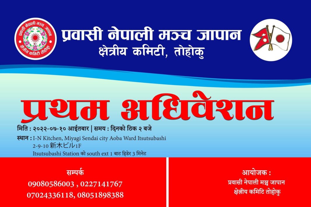 आईतबार हुने मञ्चको प्रथम अधिवेशनबाट जापान स्थित तोहोकुमा औपचारिक रुपमा नयां कमिटी गठन गर्ने तयारी रहेको छ । कार्यक्रम स्थल पहिचान गरि आउनेका लागी सहजता मिलाउन ०९०८०५८६००३, ०२२७१४१७६७, ०७०२४३३६११८ र ०८०५१८९८३८८ मा सम्पर्क गर्न समेत मञ्चले अनुरोध गरेका छन् ।