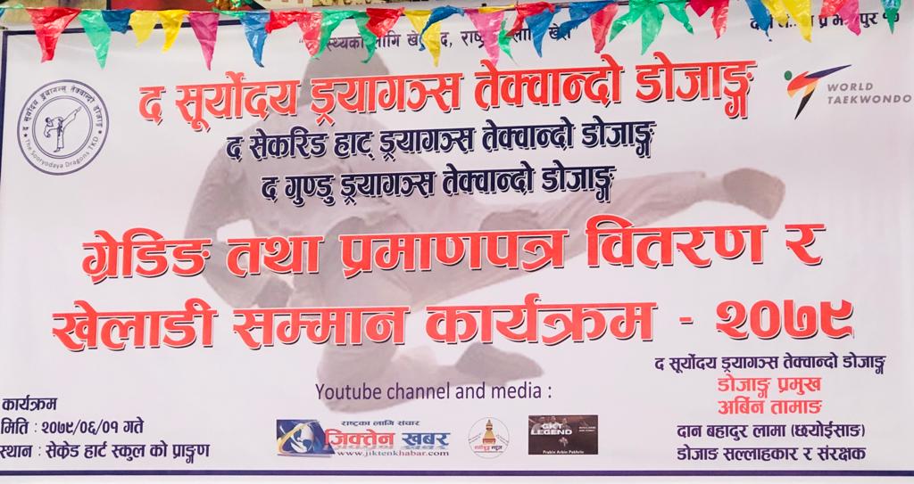 काठमाडौ । द सूर्योदय ड्रयागञ्स तेक्वान्दो डोजाङ्गको आयोजनामा ग्रेडिङ तथा प्रमाण पत्र वितरण तथा खेलाडी सम्मान कार्यक्रम २०७९ सम्पन्न भएको छ । शनिबार भक्तपुर स्थित सेक्रेड हार्ट स्कुलको प्राङ्गणमा सम्पन्न उक्त कार्यक्रममा द सूर्योदय ड्रयागञ्स तेक्वान्दो डोजाङ्ग, द सेकरिड हाट ड्रयागञ्स तेक्वान्दो डोजाङ्ग, द गुण्डु ड्रयागञ्स तेक्वान्दो डोजाङ्ग गरि तिन वटा डोजाङ्गका खेलाडीहरु सहभागी रहेका थिए ।