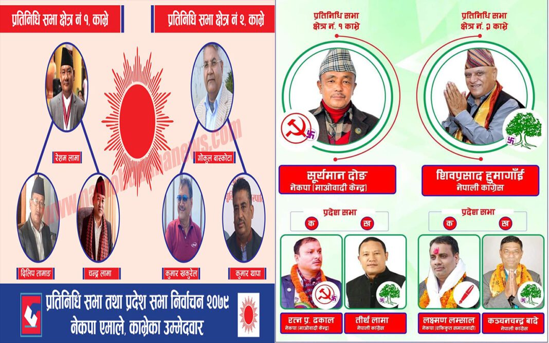 सत्तारुढ गठबन्धनको तर्फबाट साझा उम्मेदवारको रुपमा प्रतिनिधि सभा काभ्रे क्षेत्र नं.१ मा माओवादी केन्द्रको सुर्यमान दोङ(लालध्वज) र प्रतिनिधि सभा क्षेत्र नं.२ मा नेपाली कांग्रेसका शिवप्रसाद हुमागाँईले उम्मेदवार दिएका छन् । प्रदेश सभा तर्फ क्षेत्र नं.१ को क मा माओवादी केन्द्रको रत्न ढकाल र ख मा तिर्थ लामाले उम्मेदवारी दर्ता गरेका छन् । त्यसै गरि क्षेत्र नं.२ को क मा एकिकृत समाजवादीका लक्ष्मण लम्साल र ख मा नेपाली कांग्रेसका कञ्चन चन्द बादेलाई साझा उम्मेदवारको रुपमा मनोनयन दर्ता गरेका छन् । गठबन्धनको साझा उम्मेदवार यी दुवै जना काभ्रेको प्रभावसाली नेताहरु हुन् । पूर्वमन्त्री सुर्यमान दोङले भने नेकपा एमालेका रेशम लामासंग प्रतिश्पर्धामा उत्रिने भएको छ । यत्ता क्षेत्र नं.२ मा भने शिवप्रसाद हुमागाँईले गोकुल बास्कोटा संग प्रतिश्पर्धा गर्ने भएको छ । संविधान सभा सदस्य समेत रहेका नेपाली कांग्रेसको प्रभावशाली नेताको रुपमा चिनिएका तिर्थ लामा भने यस पटक क्षेत्र नं.१ को ख बाट प्रदेश सभाको उम्मेदवारी भएका छन् । जसका कारण अधिकांश कांग्रसका युवाहरु निराश बनेका छन् ।