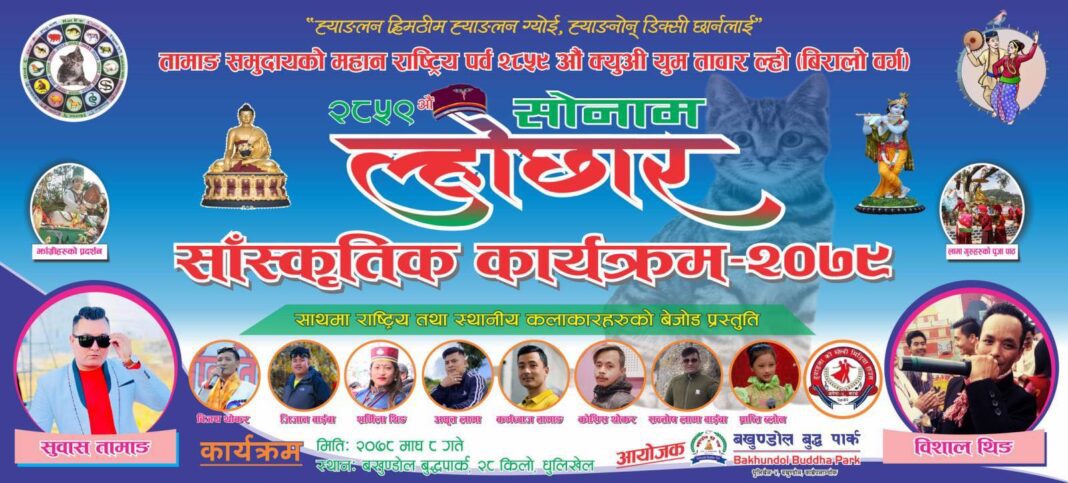 काठमाडौं । काभ्रेको धुलिखेल २९ किलो स्थित बखुण्डोल बुद्धपार्कमा यहि ८ गते बृहत सोनाम ल्होछार साँस्कृतिक कार्यक्रम हुने भएको छ । मञ्जुश्री सम्वत् २८५९ औँ ह्योअी (तावार) अर्थात बिरालो बर्ष सोनाम ल्होछारको अवसरमा उक्त कार्यक्रमको आयोजना गरिएको आयोजकले जानकारी दिएको छ ।