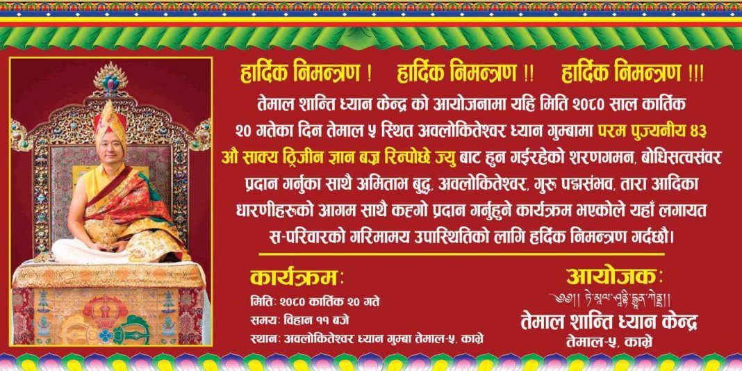 काभ्रे । तेमाल शान्ति ध्यान केन्द्रको आयोजनामा आगामी कार्तिक २० गते सोमबार काभ्रेको धार्मिक एवं सांस्कृतिक तथा पर्यटकिय स्थल तेमालमा शरणगमन, बोधिसत्त्वसंवर प्रदान गर्नुका साथै अमिताभ बुद्ध,अवलोकितेश्वर ,गुरु पद्मसंभव, तारा, आदिका धारणीहरुको आगम साथै कह्गो प्रदान गर्ने कार्यक्रम हुने भएको छ ।