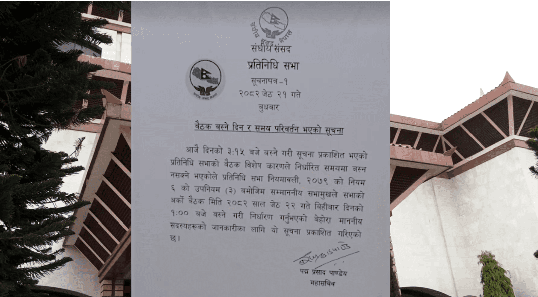 काठमाडौ । प्रतिनिधिसभाको बैठक सूचना टाँस गरि बिहीबारसम्मका लागि स्थगितगरिएको छ ।