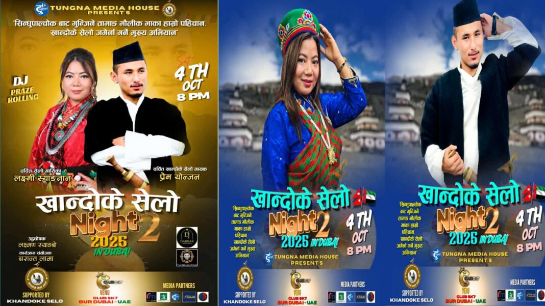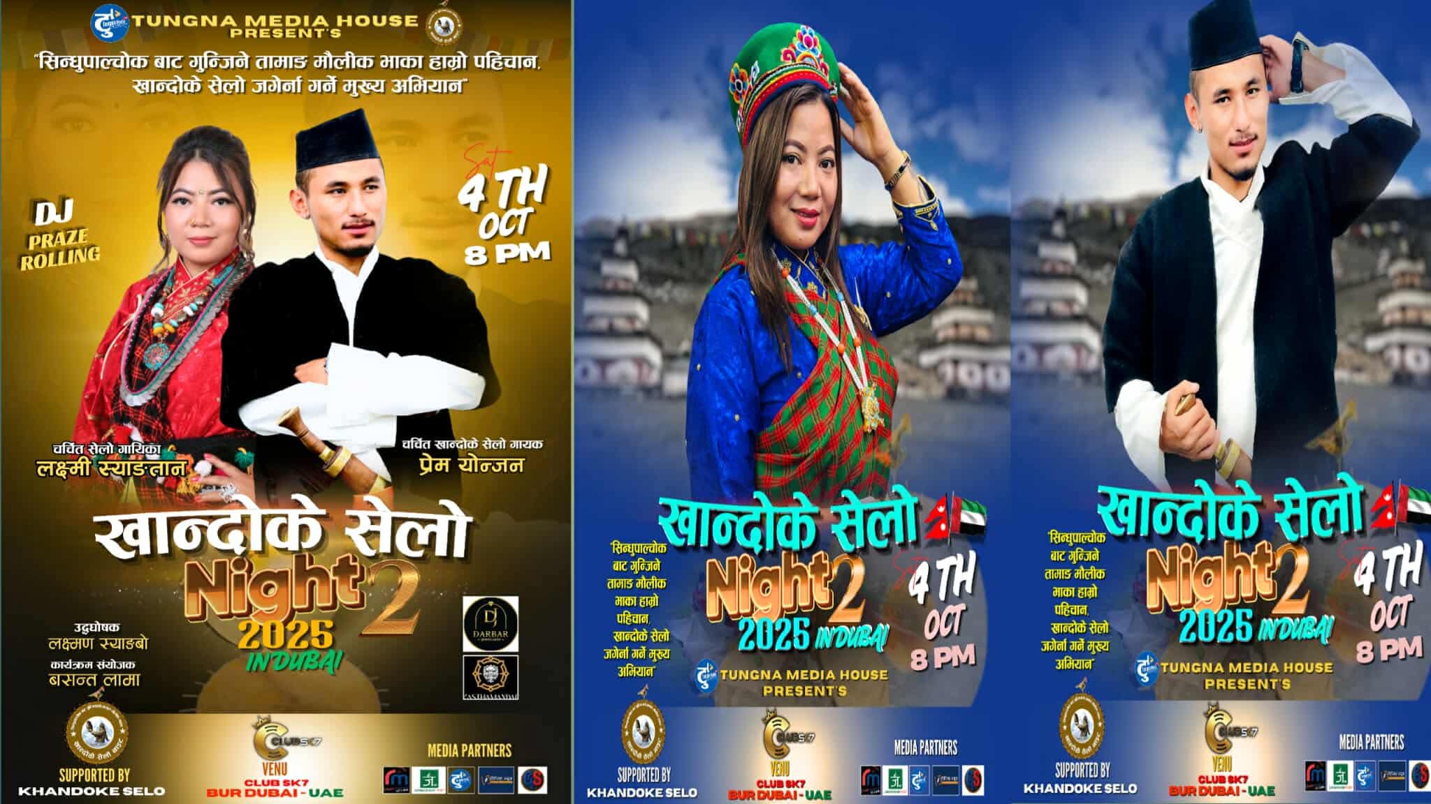 आयोजकले जानकारी दिए अनुसार नेपालबाट चर्चित सेलो गायक प्रेम योन्जन र लक्ष्मी स्याङतानले आफ्नो विशेष प्रस्तुती लियर कार्यक्रम स्थल पुग्ने भएको छ। टुङ्ना मिडियाको प्रस्तुति र खान्दोके सेलो नाइट सिजन -२ को विशेष सहयोगमा आउँदो अक्टोबर ४ मा “सिन्धुपाल्चोक बाट गुन्जिने तामाङ मौलिक भाका हाम्रो पहिचान, खान्दोके सेलो जगेर्ना गर्ने मुख्य अभियान” भन्ने मुल नाराका साथ तामाङ मौलिक भाका खान्दोके सेलोको जगेर्ना गर्ने उदेश्यले खान्दोके सेलो नाइट” सिजन -२ कार्यक्रम दुवईको सुन्दर सहर बरदुवाइ SK7 CLUB मा भव्य रूपमा आयोजना हुने भएको छ।
