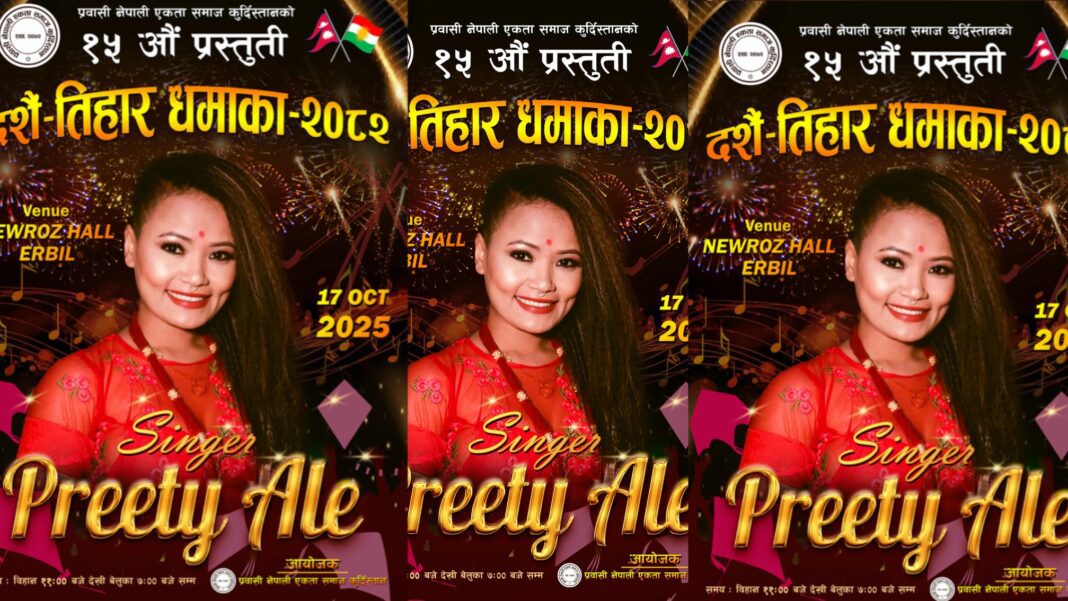 17 अक्टोबर 2025 का दिन नवोरोज हल (अर्बिल)मा बिहान ११ बजेदेखि बेलुका ७ बजे सम्म हुने उक्त कार्यक्रममा शुभकामना आदनप्रदानको साथै विभिन्न सांगितिक प्रस्तुतिहरु रहेने भएको छ । प्रवासी नेपाली एकता समाज कुर्दिस्तान इराकको १५ औं प्रस्तुती स्वरुप बिगत झै यसपटक पनि नेपालीहरुको महान चाड विजया दशमी तथा शुभ दिपावली २०८२ को पावन अवसरमा आयोजित शुभकामना आदान-प्रदान तथा बृहत् सांस्कृतिक कार्यक्रममा नेपालबाट आमन्त्रित चर्चित लोकप्रिय गायिका प्रीती आले र स्थानीय कलाकारहरुको बेजोड प्रस्तुति रहने आयोजकले बताएको छ ।
