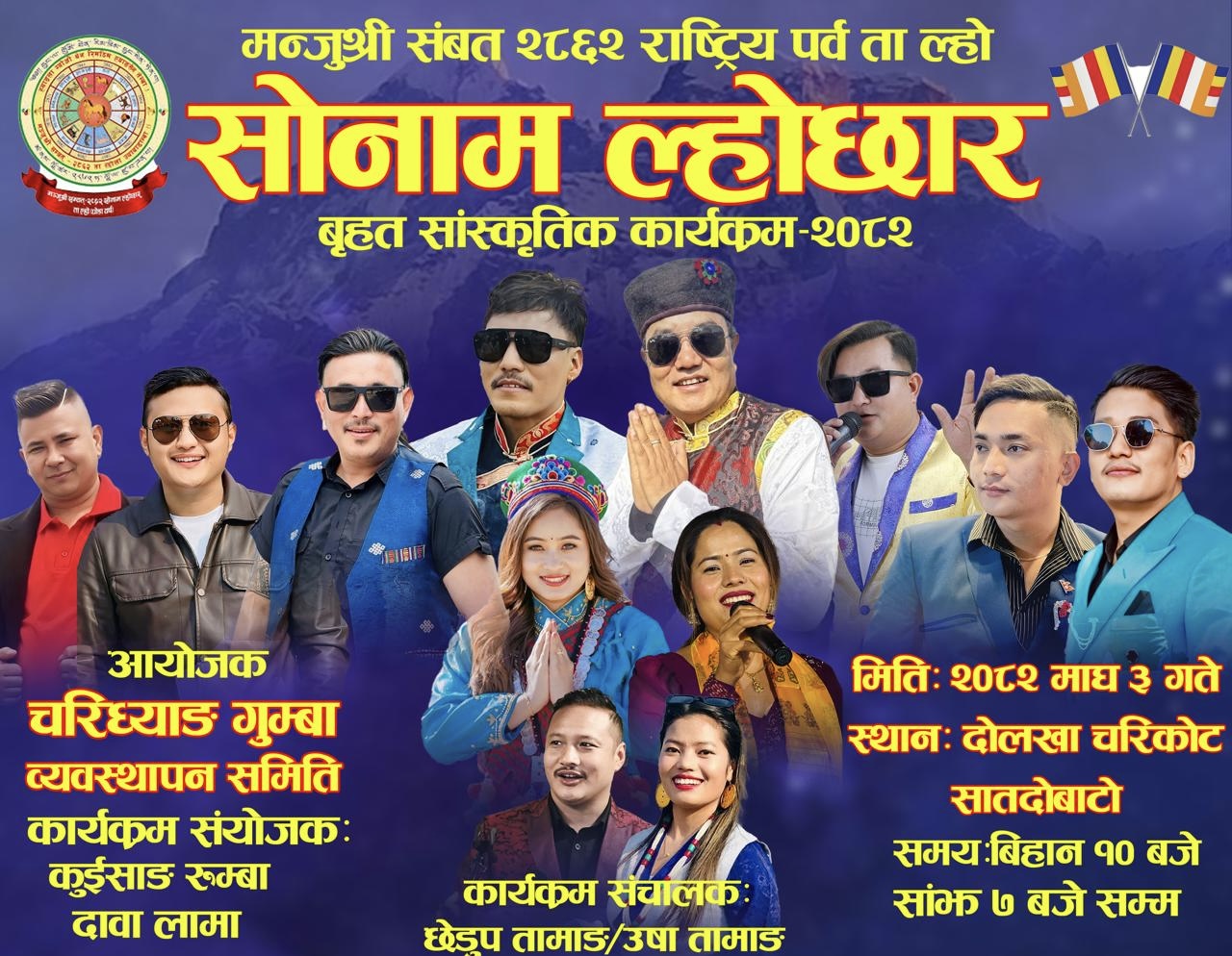 काठमाडौं । मन्जुश्री संवत २८६२ ता ल्हो राष्ट्रिय पर्व सोनाम ल्होछारको अवसरमा चरिघ्याङ गुम्बा व्यवस्थापन समितिले यहि माघ ३ गते बृहत ल्होछार सांस्कृतिक कार्यक्रम-२०८२ को आयोजना गरिने भएको छ ।